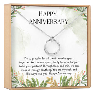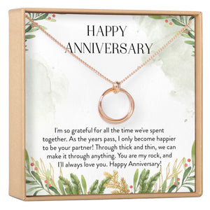 Anniversary Gift Quote: I'm so grateful for all the time we've spent together. As the years pass, I only become happier to be your partner! Through thick and thin, we can make it through anything. You are my rock, and I'll always love you. Happy Anniversary!